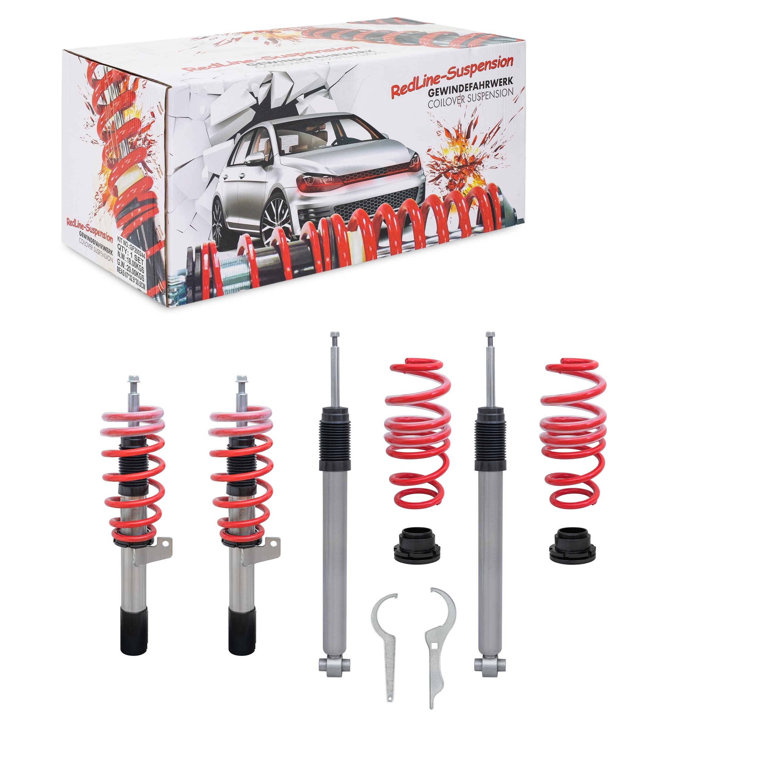 • El ajuste de altura está en el estado instalado. El chasis tiene una recogida de carga de fuerza de cizallamiento particularmente alta y está especialmente adaptado al vehículo respectivo. Las suspensiones de bobina RedLine son soluciones completas listas para instalar.